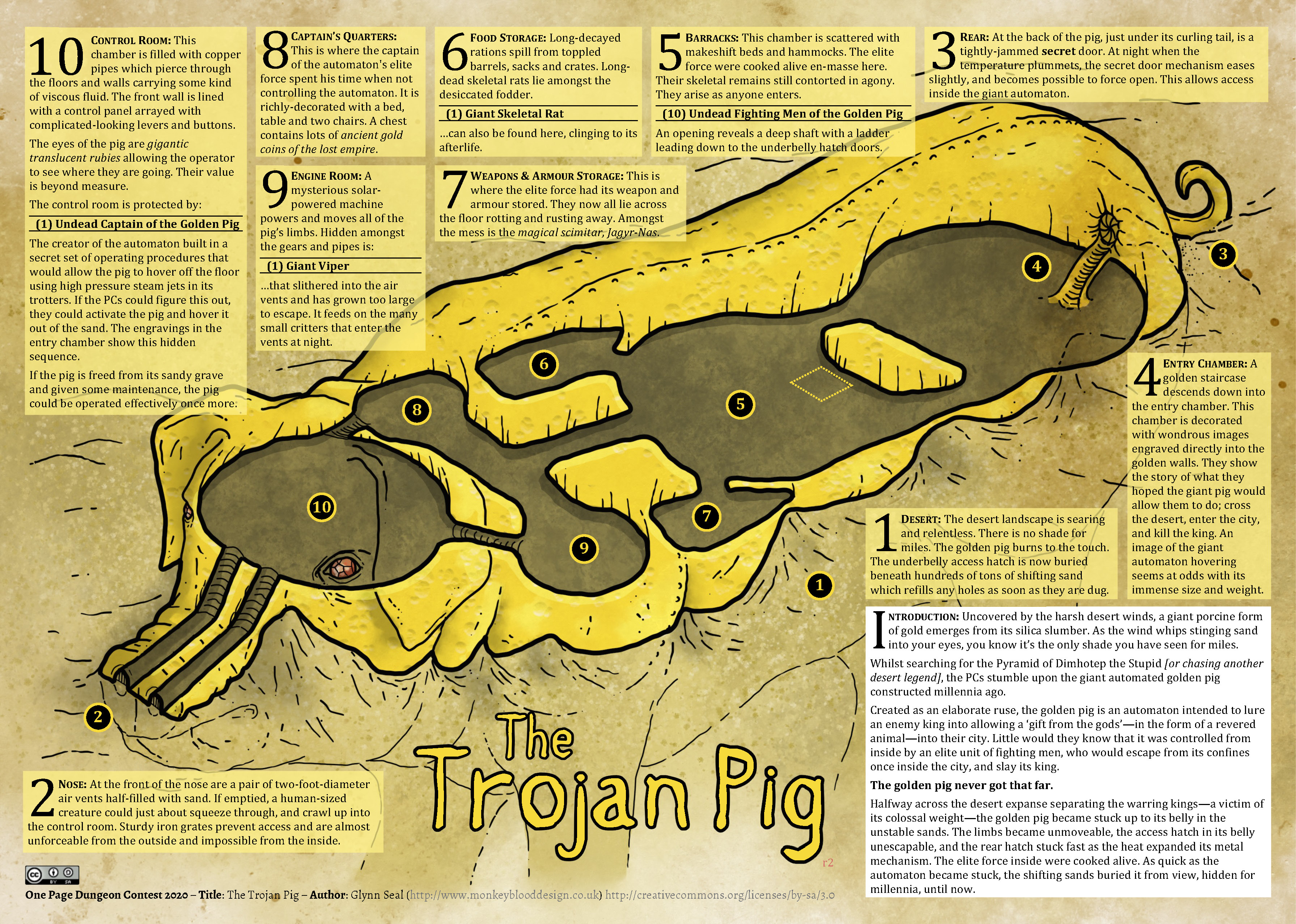 INTRODUCTION: Uncovered by the harsh desert winds, a giant porcine form of gold emerges from its silica slumber. As the wind whips stinging sand into your eyes, you know itโs the only shade you have seen for miles. Whilst searching for the Pyramid of Dimhotep the Stupid [or chasing another desert legend], the PCs stumble upon the giant automated golden pig constructed millennia ago. Created as an elaborate ruse, the golden pig is an automaton intended to lure an enemy king into allowing a โgift from the godsโโin the form of a revered animalโinto their city. Little would they know that it was controlled from inside by an elite unit of fighting men, who would escape from its confines once inside the city, and slay its king. The golden pig never got that far. Halfway across the desert expanse separating the warring kingsโa victim of its colossal weightโthe golden pig became stuck up to its belly in the unstable sands. The limbs became unmovable, the access hatch in its belly inescapable, and the rear hatch stuck fast as the heat expanded its metal mechanism. The elite force inside were cooked alive. As quick as the automaton became stuck, the shifting sands buried it from view, hidden for millennia, until now.