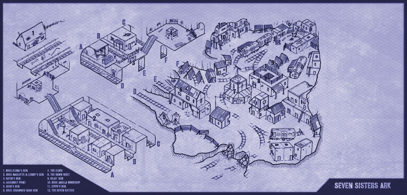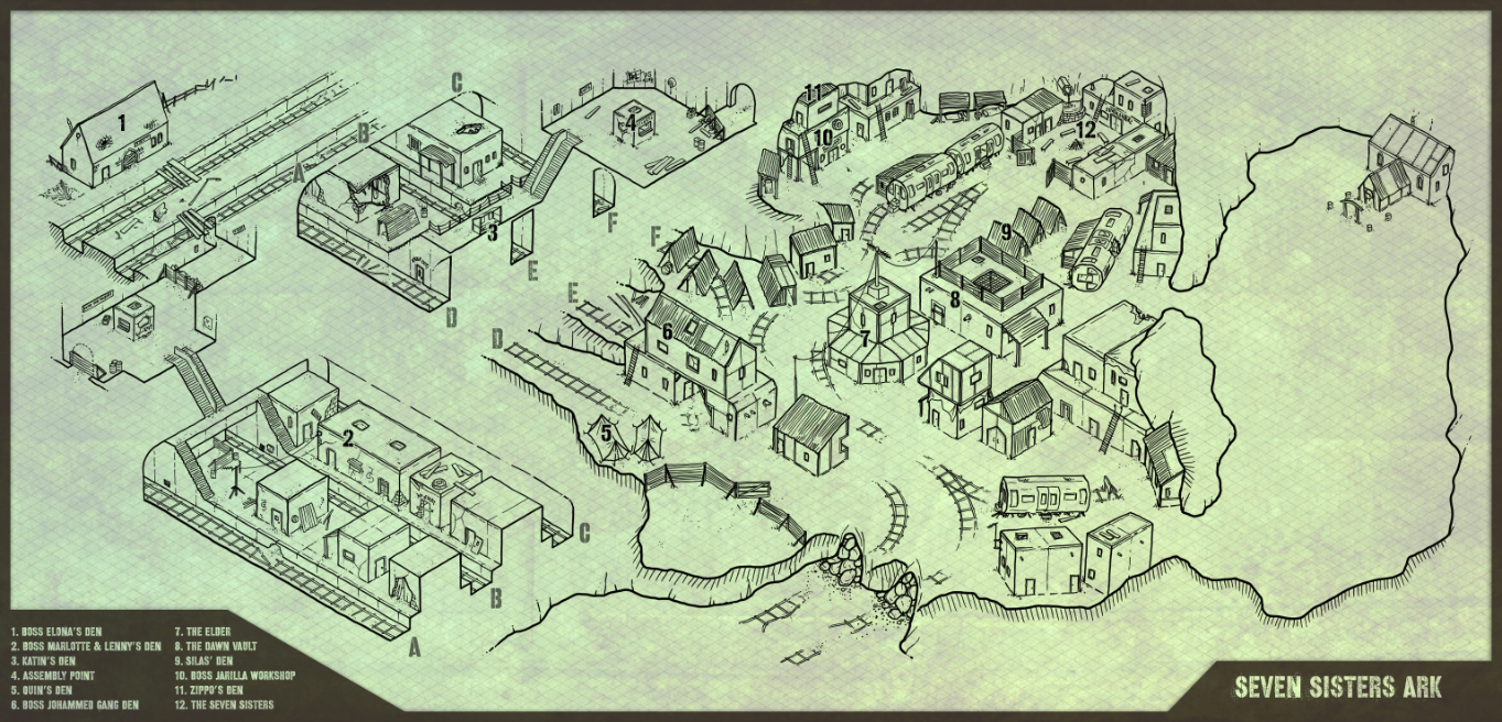 We would also include ‘upgrades’ to the map such as watchtowers, windmills, generators, lighting, and such for unlocking by the players as they level up their Ark. The basic map would not show these upgrades. I also wanted the map to have an old blueprint feel… (ah! the smell of ammonia!). Drawing in isometric really takes me back to my technical drawing and draughting days!